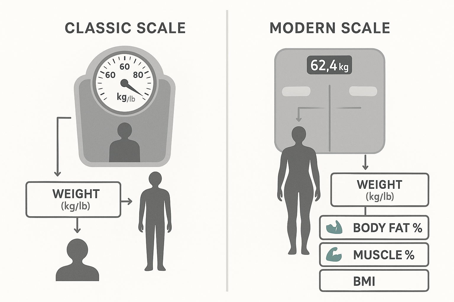 This is why relying on a simple scale doesn’t give a real grasp on the reality of your body-weight composition. You may lose weight because of a loss in muscular tone, which may be unhealthy even though inevitable in some phases of one’s life. Or you may lose weight due to a loss of body fluids (i.e., water), which is even worse.