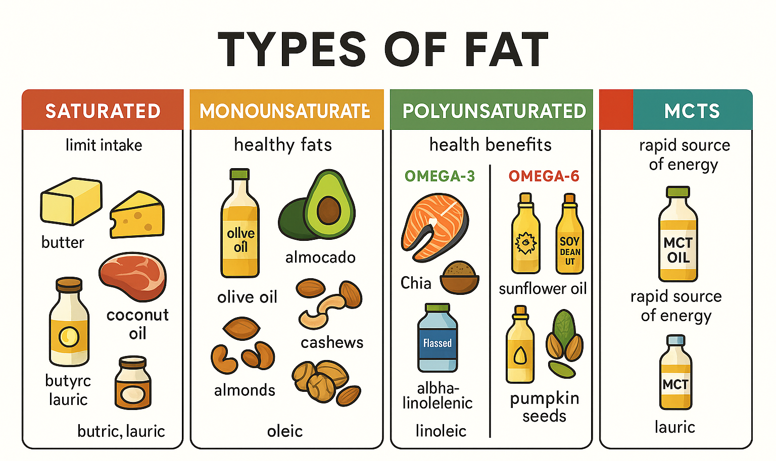 Fat is a major source of energy for low-intensity activities (i.e., everyday life), and it helps you absorb some vitamins and minerals. It is necessary to build cell membranes and the sheaths surrounding nerves. It is essential for blood clotting, muscle movement, and as an anti-inflammatory. For long-term health, some fats are better than others. Good fats include monounsaturated fats, present in avocados, nuts, seeds, and oils, and polyunsaturated fats, present in fish, nuts, seeds, and oils. Bad ones include industrially made trans fats, present in hydrogenated oils (PHOs), many commercially baked goods, fried food, and packaged snacks (cookies, chips, popcorn). Saturated fats, present, for instance, in red meat, whole milk, and other whole-milk dairy foods, cheese, coconut oil, and some commercially prepared baked goods, fall somewhere in the middle. (Source: Harvard Medical School, https://www.health.harvard.edu/staying-healthy/the-truth-about-fats-bad-and-good).